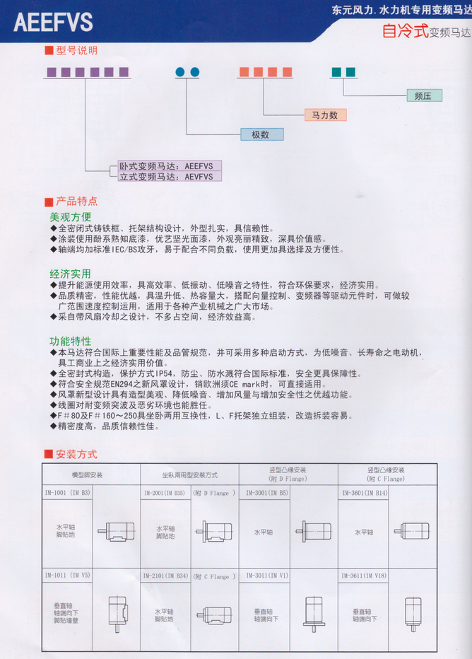 TECO東元變頻電機種類:三相鼠籠式感應電動機 保護方式:IP54:全密式 安裝方式:EVEF 水平腳座安裝(IM1001) EVVF 凸托架安裝(IM3001) 極數:4P 6P 8P 額定輸出:1/2-125 1/4-100 25-60 馬達電源:3#220,380,415,440,460V 50 or 60HZ(其他電源) 時間額定:連續額定,使用系數S.F:1.0 轉矩特性:定轉矩負載適用范圍:1:10 遞減轉矩負載適用范圍:1:20,轉矩成正比與轉平 方遞減 啟動轉矩:125%額定轉矩 絕緣等級:F級(附熱保護器---常閉型) |